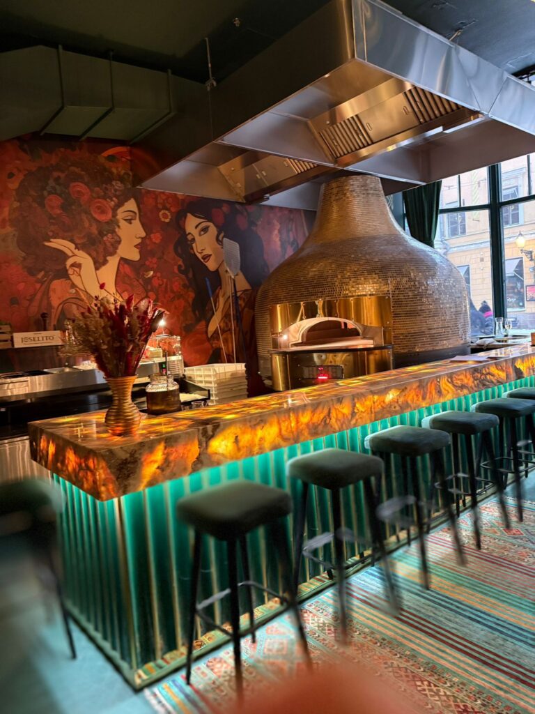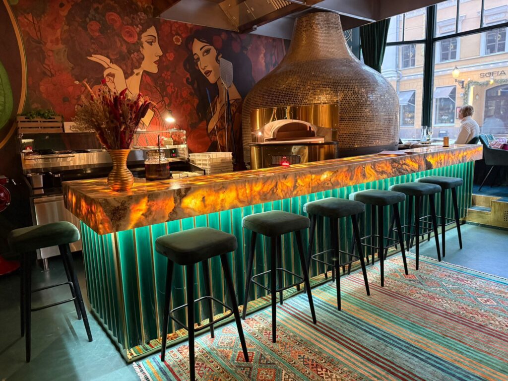 Tiskin etupinta on toteutettu vihreästä onyksista. Onyx on valoa läpäisevä luonnonkivi, jonka rakenne mahdollistaa näyttävän taustavalaistuksen. Kun valaistus kytketään päälle, koko tiski herää eloon ja toimii ravintolan katseenvangitsijana. Onyxin ja marmorin yhdistelmä tuo tilaan luksusta, mutta hallitusti – juuri oikeassa suhteessa konseptiin.