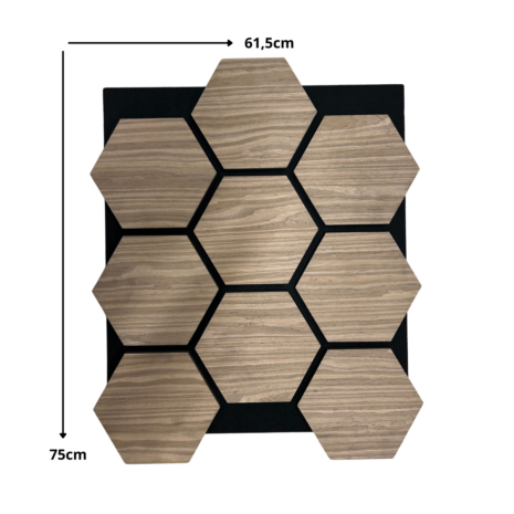 Siistit heksagonin muotoiset sisustuspaneelit, toimitetaan tuotekuvan osoittamassa kuviossa. MDF-heksagonien takana akustiikkapaneeli.
