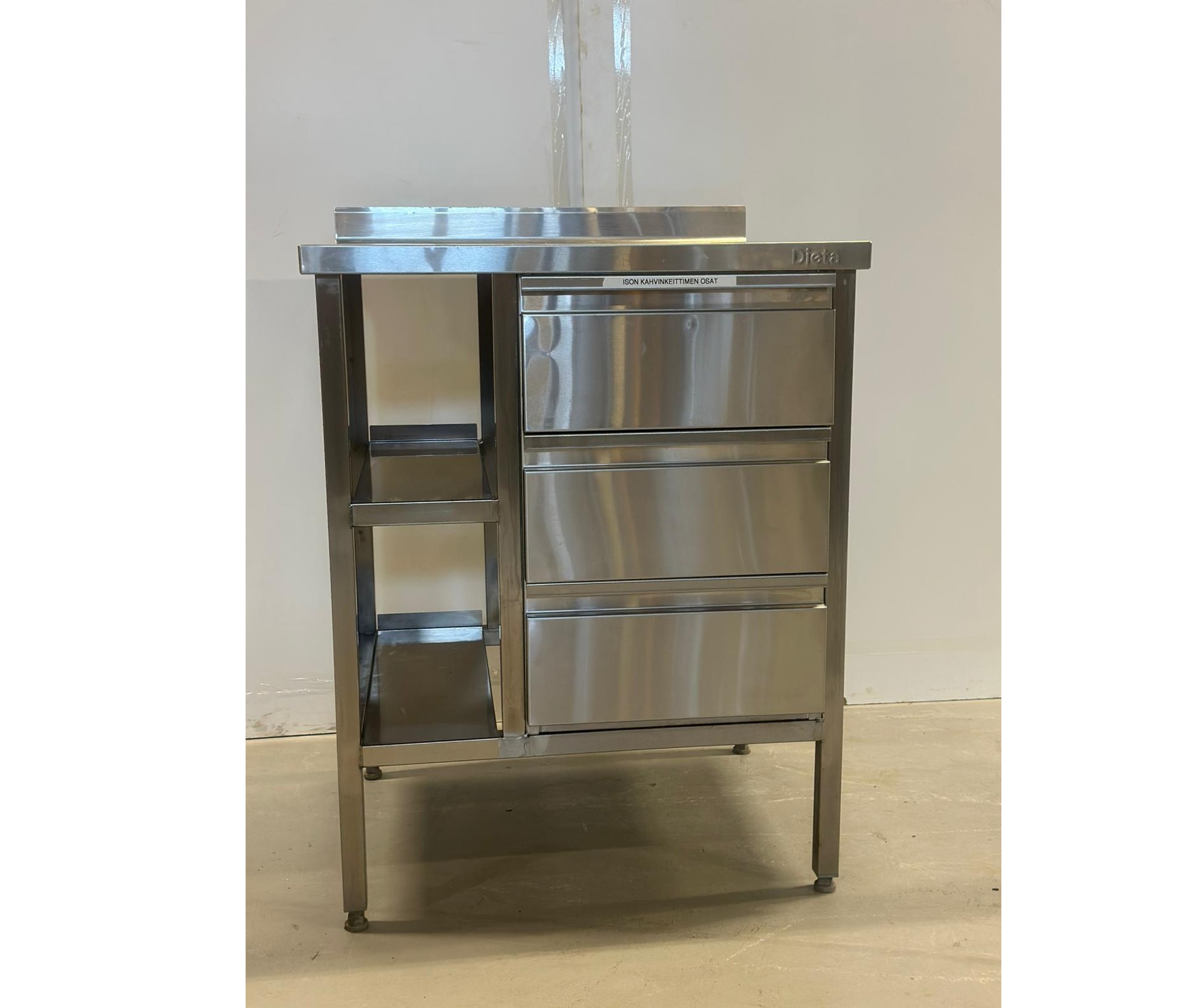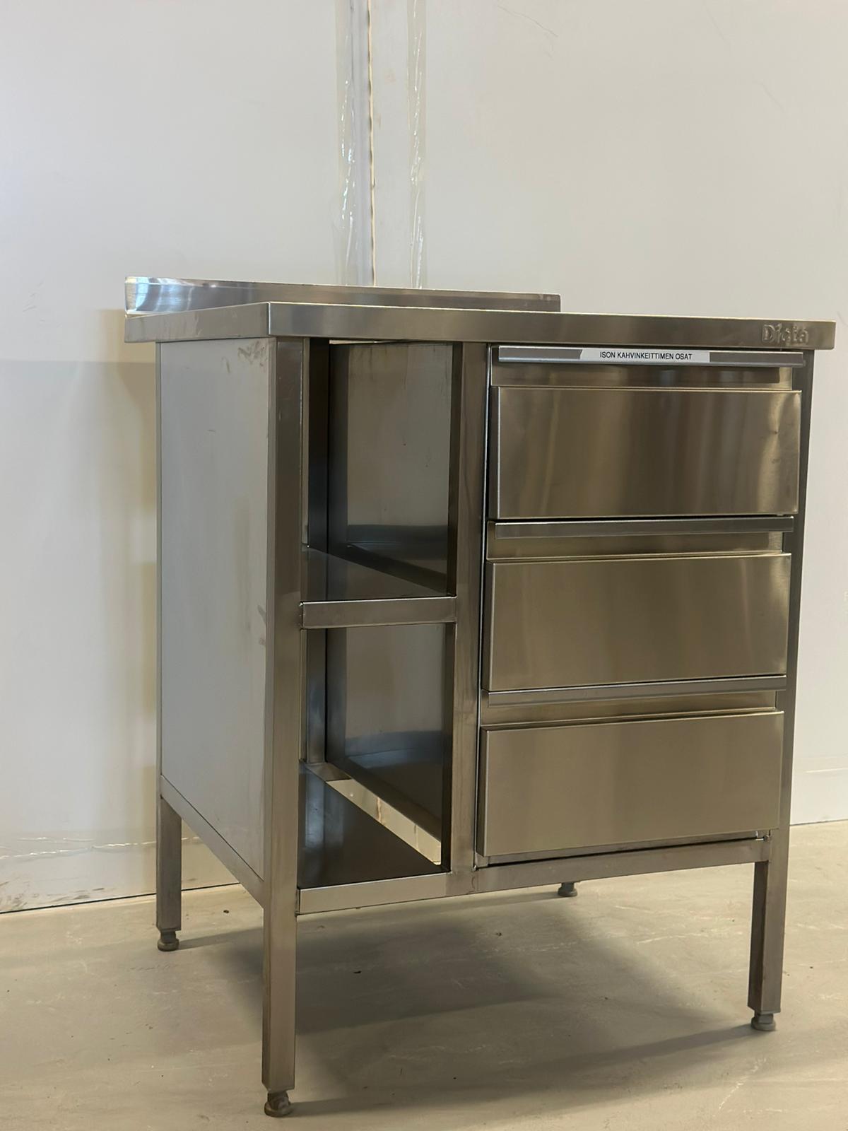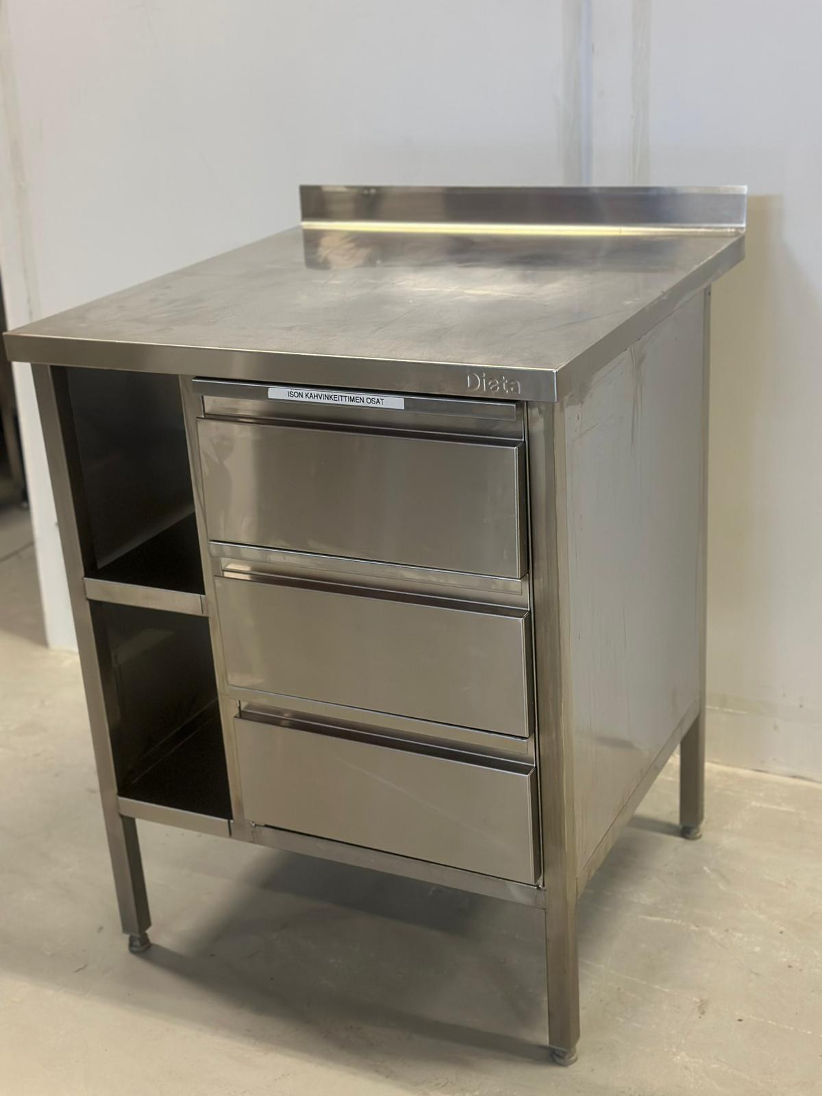 Siistikuntoinen käytetty RST-työtaso kolmella matalalla (150mm syvät gn-astiat mahtuvat) laatikolla. Kaksi kapeaa hyllyä.