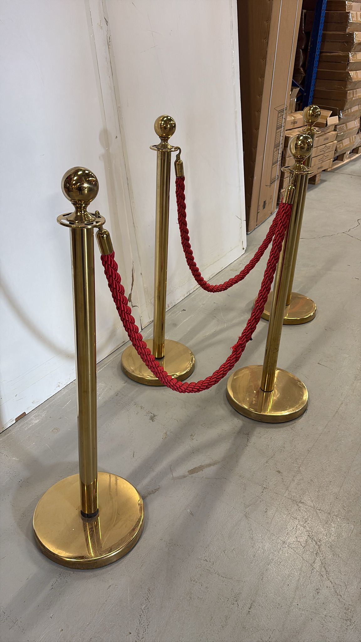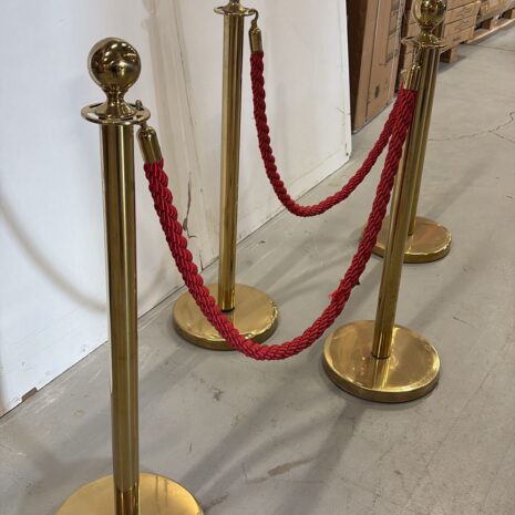 Käytetyt kultaiset kulunohjaustolpat punaisella köydellä