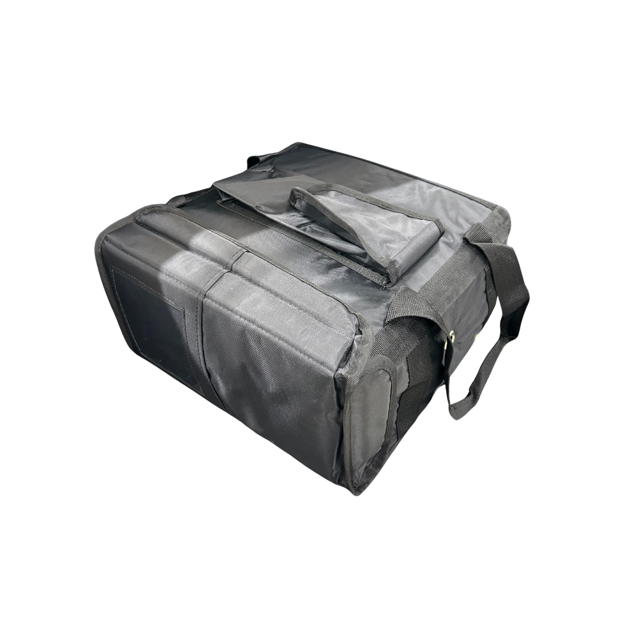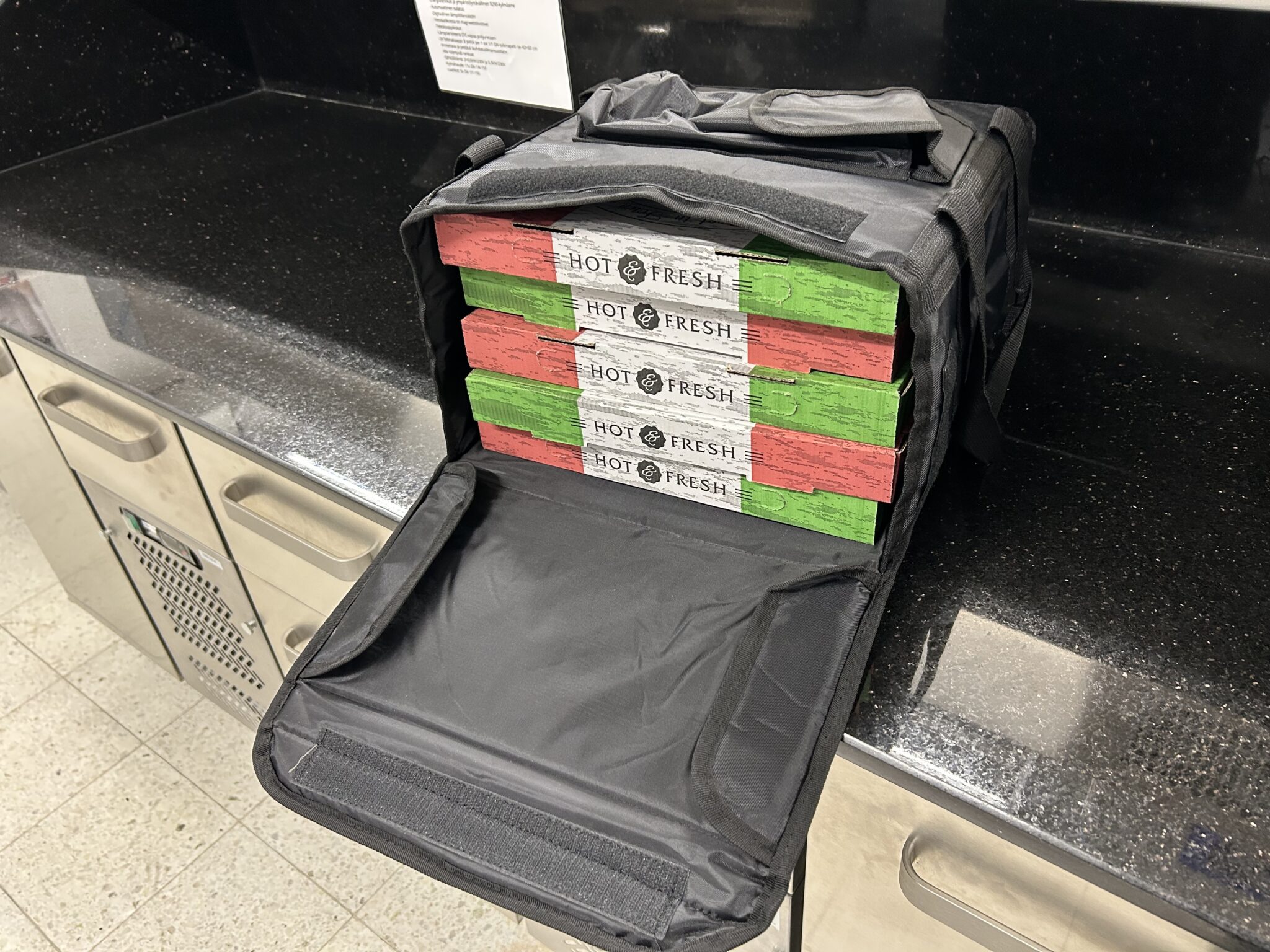 Kätevä ja kompakti pizzalaukku viidelle/kuudelle 3cm korkealle laatikolle.