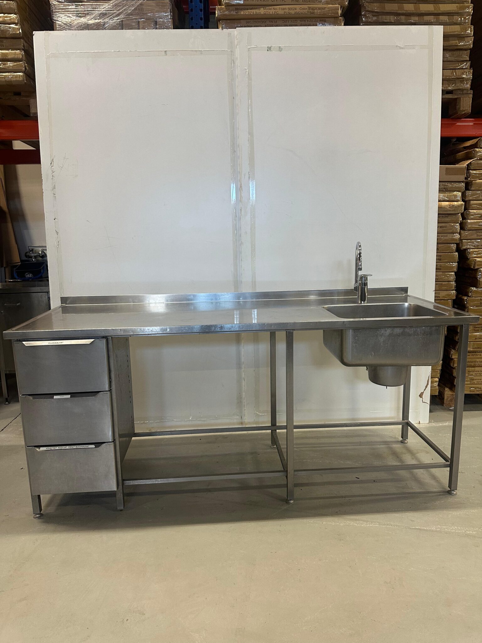 Siistikuntoinen pesupöytä altaalla ja kolmella vetolaatikoilla.