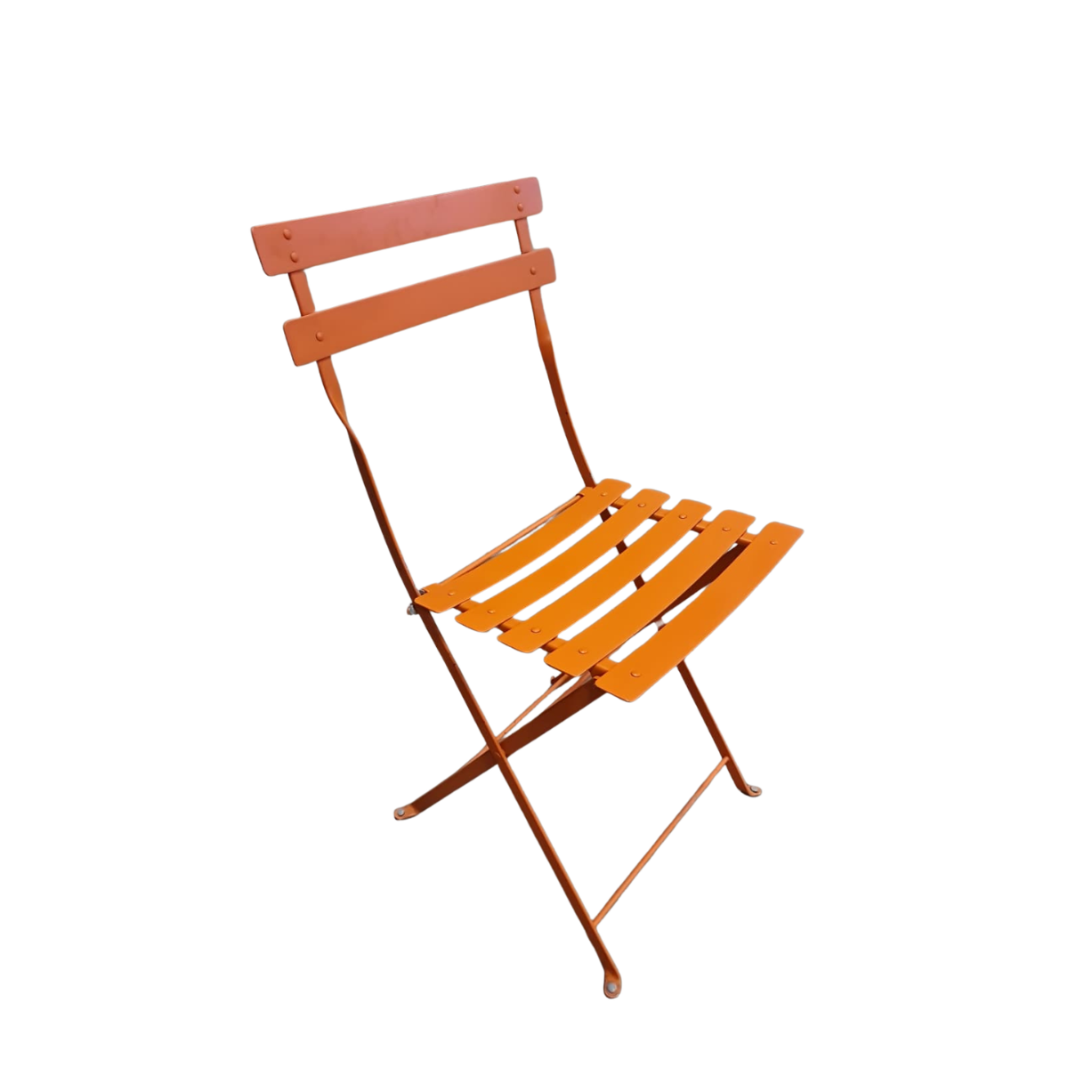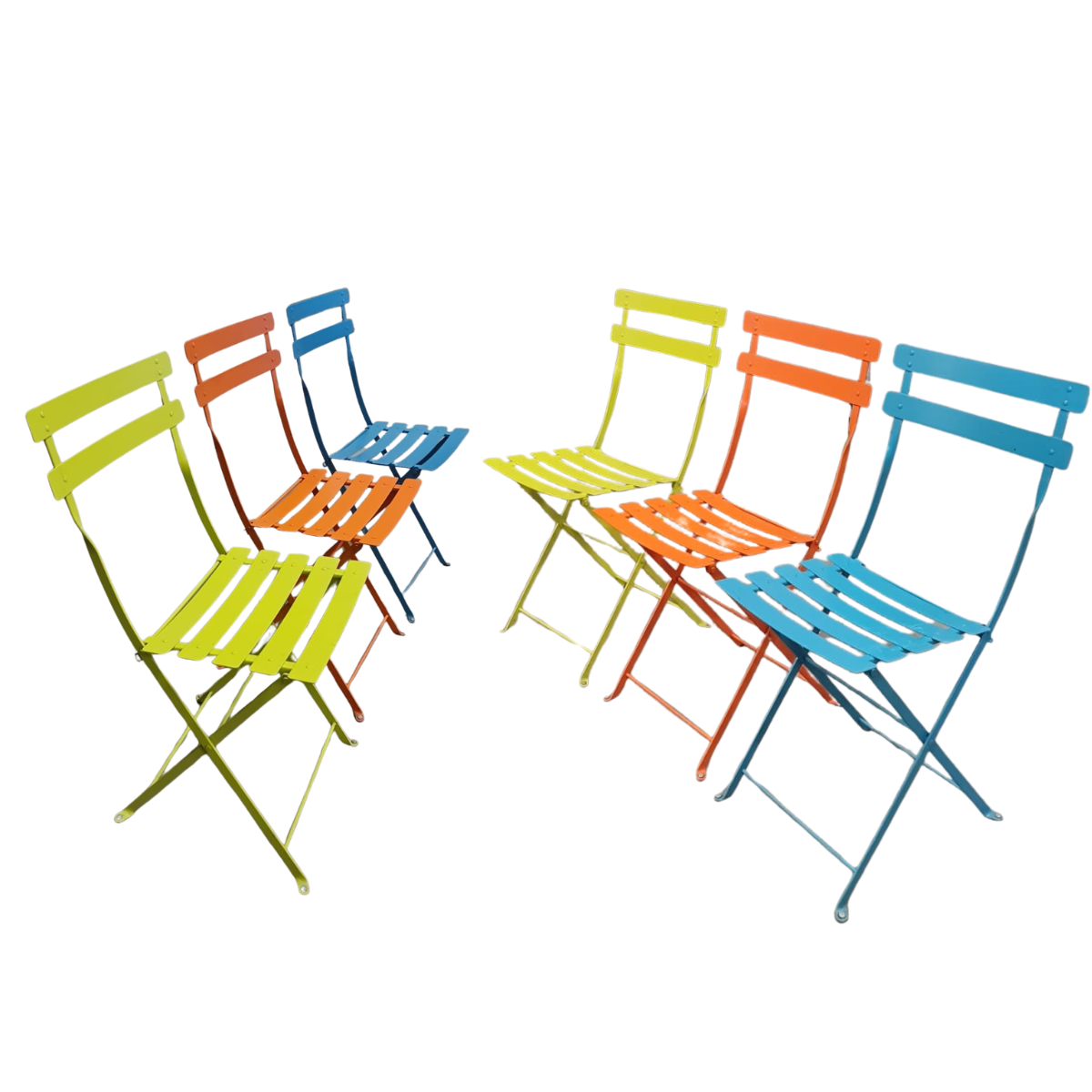 Pirtsakan värikäs terassituolisetti. Settiin kuuluu 10 kpl tuoleja väreissä vihreä, oranssi ja sininen. Tuolit ovat metallia ja kestävät näin hyvin kosteaakin säätä! Tuolit on helppo taittaa kasaan ja niputtaa terassin sulkemisen yhteydessä.