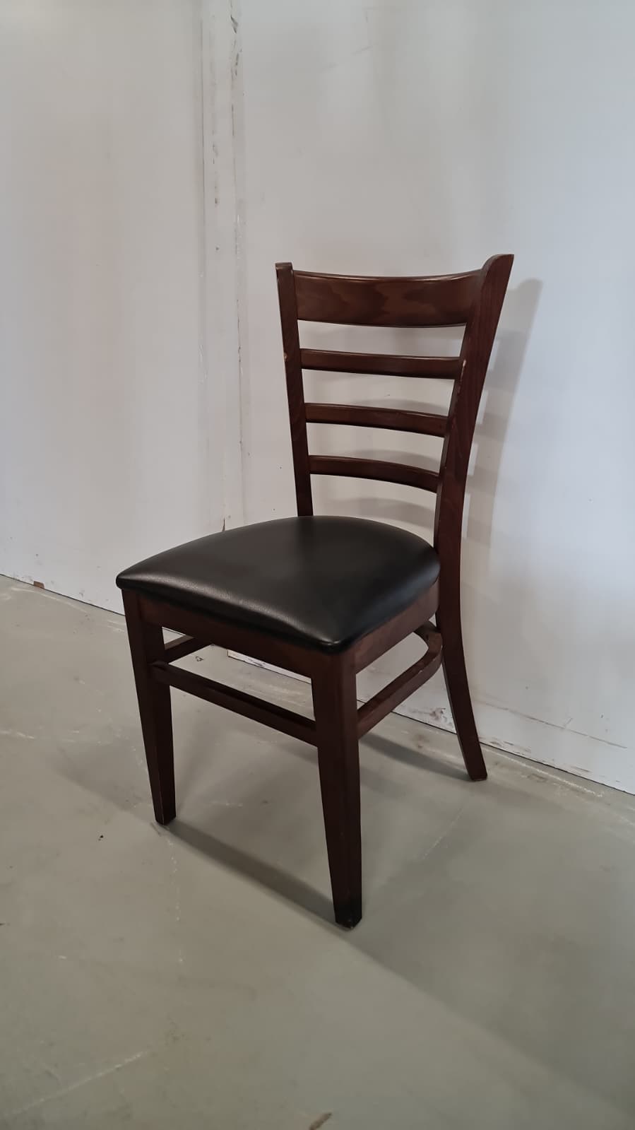Kestävät ravintolatuolit tummapuu rungolla ja nahkaisella istuimella.