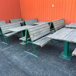 Käytetyt terassikalusteet settinä. * Pöytiä: 8 kpl (70 x 110 cm) * Penkkejä: 16 kpl (osa kaksipuolisia) * Runko: metalli, pinnat puuta * Kunto: käytetty, ehjä Myydään mieluiten koko erä kerralla. 2000+alv Nouto sovittavissa.